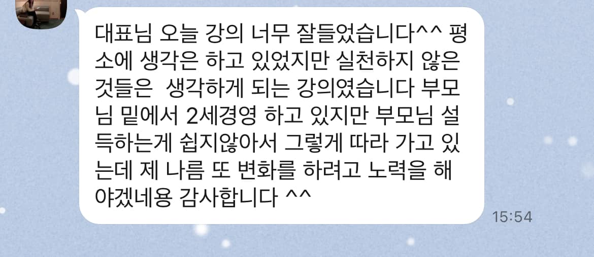 ”대표님 오늘 강의 너무 잘들었습니다^^ 평소에 생각은 하고 있었지만 실천하지 않은 것들은 생각하게 되는 강의였습니다. 부모님 밑에서 2세경영 하고 있지만 부모님 설득하는게 쉽지않아서 그렇게 따라 가고 있는데 제 나름 또 변화를 하려고 노력을 해야겠네용. 감사합니다 ^^“