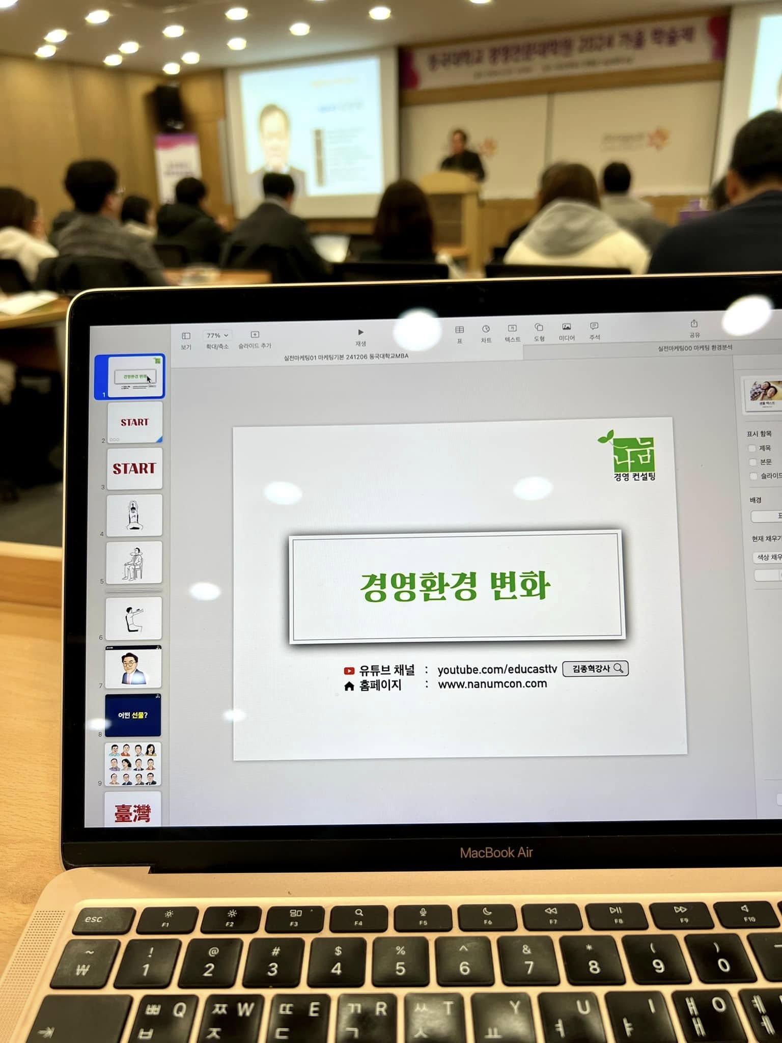 오늘은 서울에 위치한 동국대학교 경영전문대학원 학술제에 외부 강사로 초청받아 ‘경영환경 분석’ 특강을 진행했습니다. 특강에서는 다양한 이슈를 다루었지만, 특히 정치적 이슈가 경영환경에 미치는 막대한 영향에 대해 많은 분들이 공감해 주셨습니다. 강연 내내 뜨거운 호응을 보내주신 덕분에 더욱 에너지를 얻어 진행할 수 있었습니다. 정치적 이슈가 중요한 만큼, 이제 행동으로 이어가야겠죠? 다음 일정은 여의도로 이동입니다. 😊 강연에 초대해 주신 동국대학교 관계자분들께 감사드리며, 오늘 만난 모든 분들과 나눈 대화가 앞으로의 경영환경 이해에 큰 도움이 되시길 바랍니다!